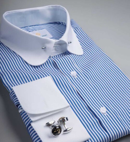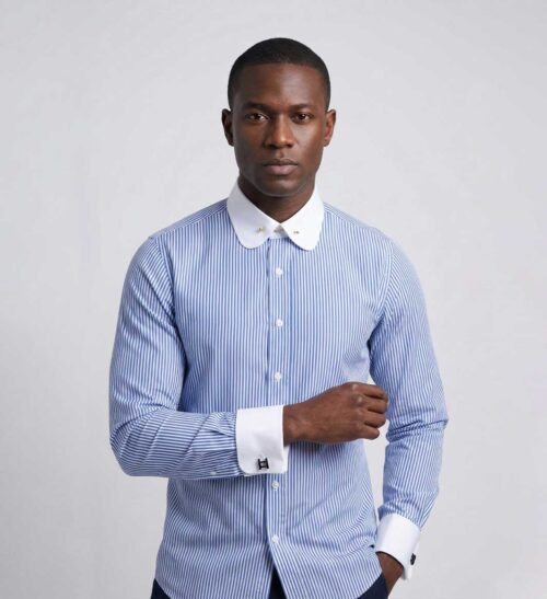 The Slim Fit Blue and White Stripe Shirt stands out with its distinctive club collar and collar bar. Featuring double cuffs and premium cotton fabric, it offers a confident statement for formal styling.